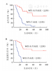SD期间WT1升高组患者中位OS时间为17(95%CI 11~23)个月,中位PFS时间为13(95%CI 8~18)个月。WT1未升高组中,中位OS与PFS时间均未达到。SD期间WT1 mRNA水平升高的患者OS和PFS时间均明显短于WT1 mRNA水平非升高患者(P值均<0.001)(图1)。