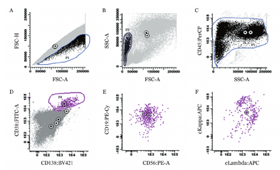 在FSC-A/FSC-H点图上设P1门去除黏连细胞,FSC-SSC点图上设P2门去除细胞碎片及死细胞,CD45-SSC点图上设有核细胞P3门,在CD38-CD138点图上设门P4,根据CD19和CD56表达,对CD19+CD56-正常浆细胞,CD19+CD56+、CD19-CD56+和CD19-CD56-异常表型浆细胞分别设门分析各抗原表达情况,进一步分析各群细胞cκ/cλ比值,确定浆细胞克隆性(图1)。