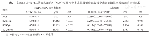 常规8色组合与二代流式细胞术(NGF)检测76例多发性骨髓瘤患者微小残留病阳性率及浆细胞比例比较