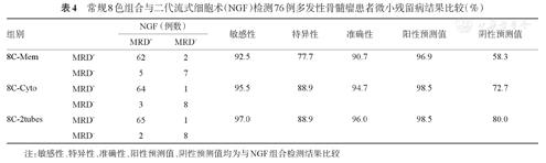分别建立一组检测胞膜抗原CD45、CD38、CD138、CD19、CD56、CD117、CD81和CD27的8C-Mem组,及一组检测胞膜及胞质抗原CD45、CD38、CD138、CD19、CD56、CD27、cκ和cλ的8C-Cyto组,将8C-Mem组和8C-Cyto组合成的8C-2tubes组,3组采用Diva软件分析浆细胞胞膜抗原表达与胞质轻链表达,统称8色组合;NGF是采用Infinicyt软件将8C-2tubes组两管数据融合,进一步分析浆细胞各抗原的表达。以20名正常对照和76例治疗后达完全缓解的MM患者骨髓样本进行检测与比较分析。