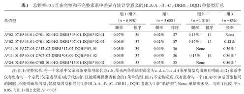 A*02∶07-B*46∶01-C*01∶02∶01G-DRB1*03∶01-DQB1*02∶01、A*02∶07-B*46∶01-C*01∶02∶01G-DRB1*07∶01-DQB1*02∶02的频率在组1和组2间差异有统计学意义(P值分别为0.003、0.025)。A*11∶01-B*27∶04-C*12∶02-DRB1*12∶02-DQB1*03∶01、A*11∶01-B*40∶01-C*07∶02-DRB1*08∶09-DQB1*04∶02的频率在组1和组3间差异有统计学意义(P值分别为0.013、0.013)。将组1和组2合并后,发现A*24∶02-B*40∶06-C*08∶01∶01G-DRB1*15∶01-DQB1*06∶02单倍型频率与组3相比差异有统计学意义(P=0.014)。表1为总频率<0.1%且在完整和不完整家系中差异有统计学意义的HLA-A、-B、-C、-DRB1、-DQB1单倍型汇总,这些总频率<0.1%的单倍型,在组2或组3中的频率较高(0.12%~0.36%)。故在家系不完整情况下,供受者HLA≥5/10相合,但他们的单倍型有可能不合。