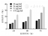 将浓度为2×105/ml的T细胞与Raji细胞按1∶1比例混合并加入不同浓度PD-1抑制剂Nivolumab培养。结果如图1显示,在不同观察时间,18、36和72 μg/ml的PD-1抑制剂Nivolumab对Raji细胞的杀伤活性差异无统计学意义(P>0.05);而144 μg/ml的Nivolumab对Raji细胞的杀伤活性高于前3个剂量组(P值均<0.05)。
