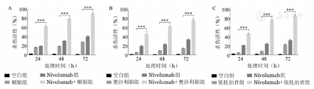 T细胞与Raji细胞株效靶比为1∶1,36 μg/ml Nivolumab与顺铂、奥沙利铂或依托泊苷联合作用,共培养24、48和72 h检测对靶细胞杀伤活性,与化疗药和Nivolumab组比较,结果显示Nivolumab联合化疗药对Raji细胞株的杀伤作用最显著(P值均<0.01)(图2)。