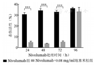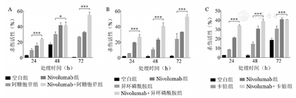 体系换用阿糖胞苷、异环磷酰胺或卡铂,共培养24、48和72 h,检测对靶细胞的杀伤活性,结果显示与各单药处理组相比,Nivolumab分别联合阿糖胞苷、异环磷酰胺或卡铂对Raji细胞株的杀伤具有协同作用,差异有统计学意义(P值均<0.05)(图3)。