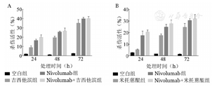 体系换用吉西他滨或米托蒽醌,共培养24、48和72 h检测对靶细胞的杀伤活性,结果显示与各单药处理组相比,Nivolumab分别联合吉西他滨、米托蒽醌对Raji细胞株杀伤活性,差异均无统计学意义(P值均>0.05)(图4)。