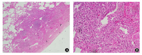 A:可见结节状病灶,淋巴滤泡增生(HE染色,×40);B:可见淋巴滤泡增生,滤泡间区较多浆细胞浸润,形态成熟(HE染色,×400)