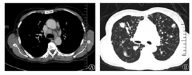 不伴BO的胸部受累MCD组共7例(23.3%),3例(42.9%)为透明血管型,4例(57.1)为浆细胞型(图3)。其中,男性3例,女性4例,年龄35~70岁,平均年龄49.29岁,明显大于前两组[分别为(27.20±3.76)岁及(37.17±2.87)岁,P值分别为0.005及0.034]。5例(71.4%)患者有胸部症状:主要症状为咳嗽(4例,占57.1%),1例伴气促,1例表现为胸痛。其余1例因发现颈部肿物就诊,1例为体检发现。2例透明血管型患者血常规正常,1例存在轻度贫血(HGB 100 g/L)。3例透明血管型患者红细胞沉降率、血清球蛋白及血气分析均正常。4例浆细胞型患者中3例存在贫血,HGB 88.0~96.0 g/L(均值为92.7 g/L);红细胞沉降率均明显增高,为104~140 mm/1 h,均值为118.7 mm/1 h;免疫球蛋白G(IgG)均增高,为22.0~176.0 g/L,均值为75.3 g/L;2例患者血气分析正常,2例患者存在轻度低氧血症,不吸氧情况下动脉血氧分压73.1~78.8 mmHg(1 mmHg=0.133 kPa)。6例患者肺通气功能正常,1例存在轻度限制性通气功能障碍。3例透明血管型患者为肺门和(或)纵隔淋巴结受累伴全身其他淋巴结[颈部、锁骨上、腋窝、腹部和(或)腹股沟]受累,4例浆细胞型患者均有肺实质受累,伴肺门和(或)纵隔淋巴结和(或)全身其他淋巴结[颈部、锁骨上、腋窝、腹部和(或)腹股沟]受累。CT显示淋巴结长径(3.10±0.93)cm,明显小于前两组[分别为(9.87±1.62)cm及(5.41±0.50)cm,P值分别为<0.001及0.036];淋巴结短径(1.83±0.51)cm,明显小于前两组[分别为(4.73±1.63)cm及(3.62±0.26)cm,P值分别为0.006及0.011]。淋巴结平扫CT值为30~49 HU,均值为39 HU,5例(71.4%)密度均匀,2例密度不匀,强化后CT值为62~92 HU,均值为79 HU(图4A)。4例肺实质受累患者表现为双肺弥漫性病变,分别表现为:①双肺间质性肺炎,双肺小叶间隔增厚,可见磨玻璃状、斑片状模糊影;②两肺弥漫分布斑点、斑片状模糊影,部分可见树芽征,部分病灶为结节状(0.2~0.3 cm),伴点状小钙化,双上肺为著,其内可见支气管气相;③双肺小叶间隔增厚,两肺可见多发大小不等磨玻璃结节影(病变最大者直径为0.84 cm),沿肺纹理分布,边缘稍模糊,可见毛刺,病变可累及斜裂胸膜;④两肺可见多发斑片状、团片状实变影(病变最大者直径为2.5 cm)及磨玻璃密度影,以实变影为主,可见支气管气相,病变可累及斜裂胸膜(图4B)。2例浆细胞型患者脾脏肿大,2例患者行颈部淋巴结活检明确诊断,2例患者行纵隔肿物切除术明确诊断(其中1例同时行锁骨上淋巴结活检),其余3例有肺实质受累的患者均行肺楔形切除术,其中1例同时行纵隔淋巴结活检。明确诊断后分别予化疗、糖皮质激素、沙利度胺、利妥昔单抗治疗,合并间质性肺炎患者同时加用吡非尼酮治疗,间质性病变有所吸收。最长随诊时间为10年,病变进展缓慢。30例胸部受累CD患者中5例患者行PET-CT检查,肿大淋巴结糖代谢增高,最大标准摄取值为3.1~5.1,均值为3.9。