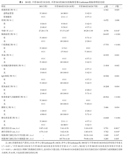 CD于1956年由Castleman首次报道[2],是一类非肿瘤性淋巴组织增生性疾病,临床罕见,美国大数据显示,CD的发病率为(21~25)/100万[3]。CD可发生于任何存在淋巴组织的部位,其中胸部最常见,占60%~70%[4]。CD可发生于任何年龄段,但多见于成年人,CD的病因与发病机制目前尚不明确,相关因素包括:①病毒感染,如:人类疱疹病毒8(HHV-8)、HIV、EB病毒;②体内细胞因子调节异常,如IL-6表达增加;③血管内皮因子调节异常[5]。本研究中CD无明显的性别差异,透明血管型以UCD为主,浆细胞型以MCD为主,UCD发病率高于MCD,透明血管型多于浆细胞型,与文献报道一致[6,7],文献报道混合型少见,本研究中未发现混合型。我们的研究单独分出特征性的伴BO的CD组,BO是由小气道炎症引起的慢性气流阻塞的临床综合征,属少见病,继发于CD的更为罕见,迄今为止,国外报道了40余例继发于CD的BO患者[8,9,10];本研究结果显示,合并BO的CD病理类型均为透明血管型,多为UCD,与文献报道一致[11]。Luo等[12]报道,胸部MCD的发病年龄大于胸部UCD,我们将胸部受累CD分为三组后同样得出不伴BO的MCD组年龄明显大于BO组及不伴BO的UCD组。