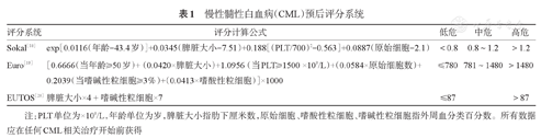 许多因素影响着CML的慢性期及生存期。慢性期患者目前常用的评分系统包括Sokal、Euro以及EUTOS(表1),均以临床特点以及血液学指标作为预后评分因素。目前无明确数据判断三种预后积分系统的优劣,无论采取何种预后评估方式,建议对高危的患者采用更为积极的治疗和监测。
