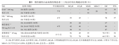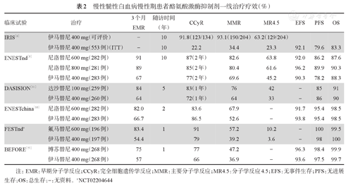 注:IM:伊马替尼;DAS:达沙替尼;NIL:尼洛替尼;MCyR:主要细胞遗传学反应;CCyR:完全细胞遗传学反应;MMR:主要分子学反应;MR4.5:分子学反应4.5;PFS:无进展生存;OS:总生存;-:无资料
