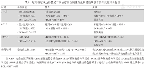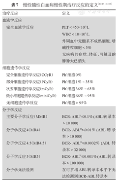 注:CHR:完全血液学缓解;CyR:细胞遗传学反应;mCyR:次要细胞遗传学反应;PCyR:部分细胞遗传学反应;CCyR:完全细胞遗传学反应;MMR主要分子学反应;IS:国际标准化;CCA/Ph-:Ph-染色体的克隆性染色体异常;a连续2次检测明确丧失MMR并且其中1次BCR-ABLIS ≥1%
