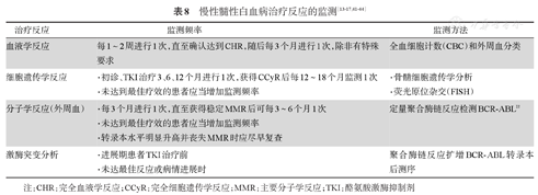 CML患者接受TKI治疗过程中疾病评价包括血液学、细胞遗传学以及分子生物学分析,及时评价治疗反应以及检测早期复发对于优化CML治疗具有重要而积极的意义。《中国慢性髓性白血病诊疗监测规范(2014年版)》[41]制订了CML治疗中血液学、细胞遗传学、分子学监测的时机和意义,是中国血液科医师日常工作的重要参考。CML慢性期患者的血液学、细胞遗传学以及分子学反应标准见表7,推荐的TKI治疗过程中血液学以及遗传学评估方式和频率见表8。