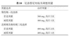 ANC<1.0×109/L或PLT<50×109/L,暂停用药,直至ANC≥1×109/L、PLT≥50×109/L恢复用药。如在2周内ANC恢复,以原剂量重新开始治疗。如停药后血细胞减少持续超过2周,剂量需减少至400 mg/d重新开始治疗。如果患者存在持续中性粒细胞减少,可采用生长因子联合尼洛替尼治疗。
