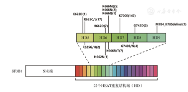 骨髓增生异常综合征(MDS)的WHO 2008诊断标准将骨髓环状铁粒幼红细胞(RS)≥15%伴单一红系或多系发育异常的患者归为难治性贫血伴环状铁粒幼红细胞增多(RARS)或难治性血细胞减少伴多系发育异常和环状铁粒幼红细胞增多(RCMD-RS)亚型[1]。我们此前的研究证实RCMD-RS患者的总生存(OS)显著差于RARS患者[2]。随后,我们和其他研究组相继报道RARS和RCMD-RS患者SF3B1突变率高达57%~80%,且SF3B1突变是MDS患者生存的良好预后因素[3,4,5]。WHO 2016诊断标准已将RARS及RS 5%~<15%且伴SF3B1突变的RA患者归为MDS-RS伴单系发育异常(MDS-RS-SLD),RCMD-RS及RS 5%~<15%且伴SF3B1突变的RCMD患者则诊断为MDS-RS伴多系发育异常(MDS-RS-MLD)[6]。本文重点探讨MDS-RS患者的基因突变,特别是非SF3B1基因突变的特征及其临床意义。