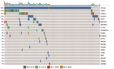 研究伴环状铁粒幼红细胞增多(RS)的骨髓增生异常综合征(MDS-RS)患者的基因突变特征及其临床意义。