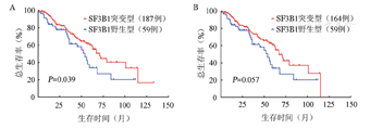 SF3B1突变型患者中位OS时间显著长于野生型患者[71(95%CI 60.90~81.09)个月对54(95%CI 42.30~65.70)个月,P=0.039](图3A)。SF3B1 K700E突变患者OS时间[67(95%CI 58.38~75.62)个月]与非K700E突变患者(未达到)相比较,差异无统计学意义(P=0.426)。RS 5%~<15%患者OS时间(未达到)与RS≥15%患者OS时间[63(95%CI 54.63~71.37)个月]比较差异无统计学意义(P=0.314。在RS≥15%患者中比较SF3B1突变与野生型患者OS时间,差异无统计学意义[67(95%CI 59.57~74.43)个月对54(95%CI 42.30~65.70)个月,P=0.057,图3B]。