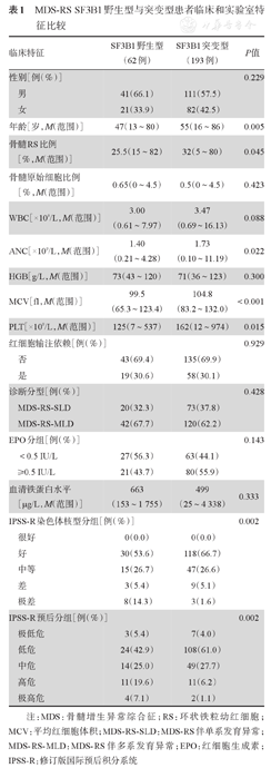 | 临床特征 | SF3B1野生型(62例) | SF3B1突变型(193例) | P值 | |