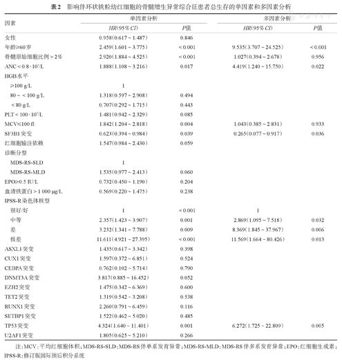 影响伴环状铁粒幼红细胞的骨髓增生异常综合征患者总生存的单因素和多因素分析