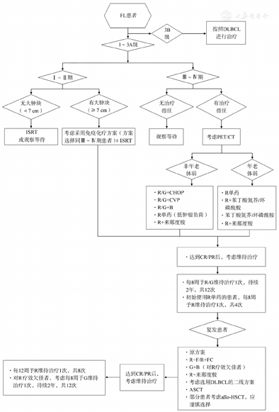FL:滤泡性淋巴瘤;DLBCL:弥漫大B细胞淋巴瘤;ISRT:受累野放疗;R:利妥昔单抗;G:奥妥珠单抗;CHOP:环磷酰胺+阿霉素+长春新碱+泼尼松;CVP:环磷酰胺+长春新碱+泼尼松;B:苯达莫司汀;CR:完全缓解;PR:部分缓解;F:氟达拉滨;FC:氟达拉滨+环磷酰胺;ASCT:自体造血干细胞移植;allo-HSCT:异基因造血干细胞移植
