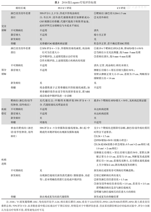 注:FDG:18F-脱氧葡萄糖;IHC:免疫组织化学;LDi:病灶最长横径;SDi:垂直于LDi的短径;PPD:LDi和SDi的乘积;SPD:最大垂直直径乘积总和;a5PS评分3分:在多数患者中提示标准治疗下预后较好,特别是对于中期评估患者,但在某些降阶梯治疗的临床试验中,评分3分被认为是治疗效果不佳,需要避免治疗不足