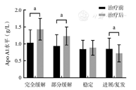 412例患者中,有341例患者接受以硼替佐米为主的化疗方案6个疗程,其中接受PCD方案者298例,接受PAD方案者18例,接受PD方案者25例。341例患者按照疗效分组,完全缓解(CR)组119例,部分缓解(PR)组97例,稳定(SD)组80例,进展/复发(PD/relapse)组45例。CR组、PR组、SD组及PD/relapse组患者治疗前Apo A1水平分别为(1.037±0.378)g/L、(0.937±0.338)g/L、(0.844±0.265)g/L和(0.851±0.320)g/L,各组间的差异均有统计学意义(P<0.05)。对规律治疗6个疗程患者治疗前后Apo A1水平进行比较,显示Apo A1在MM病程中有动态变化。CR、PR、PD/relapse组患者治疗前后的差异均有统计学意义(P<0.05)。SD组患者治疗后Apo A1水平较治疗前略升高,但差异无统计学意义(P>0.05)(图1)。