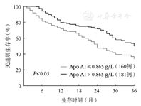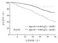 以0.865 g/L为分界值将患者分为低Apo A1组(160例)和高Apo A1组(181例)。通过Kaplan-Meier生存分析比较两组患者的总生存(OS)期和无进展生存(PFS)期。本研究随访3年,除死亡患者外无失访病例。低Apo A1组的中位OS期和PFS期分别为29个月和24个月,而高Apo A1组暂未到达中位OS期和PFS期。3年低Apo A1组死亡99例,高Apo A1组死亡57例。结果证明,Apo A1水平高的患者有更长的OS期和PFS期(P<0.05)(图3、图4)。