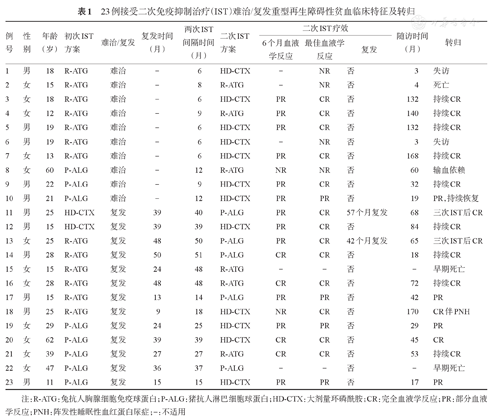 23例接受二次免疫抑制治疗(IST)难治/复发重型再生障碍性贫血临床特征及转归