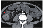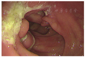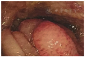 查体:身高167 cm,左足各脚趾较右侧粗短,左小腿较右侧粗;贫血貌,皮肤未见瘀点、瘀斑,全身浅表淋巴结未触及肿大,腹部无压痛、反跳痛,肝脾肋缘下未触及。外周血高通量基因二代测序发现MPL基因复合杂合突变(表1、图3)。2018年4月加用沙利度胺100 mg/d口服,并继续间断输血支持、重组人粒细胞集落刺激因子(G-CSF)、重组人血小板生成素(TPO)、重组人红细胞生成素(EPO)治疗。患者未再出现便血,偶有腹痛,因白细胞低间断有发热,粪便潜血持续阳性。2018年8月血常规:WBC 2.48×109/L,中性粒细胞绝对值0.68×109/L,HGB 69 g/L,PLT 14×109/L。PPD试验及淋巴细胞干扰素试验阴性。腹盆增强CT+小肠重建:升结肠肠壁弥漫增厚伴异常强化,符合淋巴瘤表现,邻近肠系膜区多发淋巴结(图4)。结肠镜:回盲部局部可见溃疡型病变,周围黏膜纠集、结节感,较前明显减轻,回盲部结构破坏、变形(图5);活检病理:结肠黏膜急性及慢性炎症伴肉芽组织形成;免疫组化:AE1/AE3(上皮+),CD3(散在+),CD20(散在+),CD31(血管+),CD68(散在+),Ki-67(index 5%)。原位杂交:CMV ISH(-),EBER ISH(-)。肠道病变随访2年余,3次活检病理不符合淋巴瘤诊断,沙利度胺治疗后好转,临床诊断为肠白塞病。2019年7月在外院行父供女单倍型造血干细胞移植,移植后1个月粒细胞植活,但并发出血性膀胱炎,输血、输血小板依赖,2019年11月死亡,未行尸检。