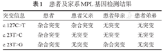 A:患者MPL基因杂合突变c.127C>T(胞嘧啶>胸腺嘧啶),导致氨基酸改变p.R43*(精氨酸>终止),来自于患者父亲;B:患者MPL基因杂合突变c.23T>C(胸腺嘧啶>胞嘧啶),导致氨基酸改变p.M8T(甲硫氨酸>苏氨酸),c.23T>G(胸腺嘧啶>腺嘌呤),导致氨基酸改变p.M8R(甲硫氨酸>精氨酸),其中c.23T>G来自于患者母亲