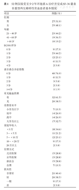 52例仅接受至少2年环孢素A治疗并完成SF-36量表非重型再生障碍性贫血患者基本情况