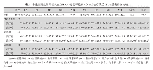 收集2014年1月至2016年1月在北京协和医院门诊初次治疗、仅使用CsA的NSAA患者,在治疗前和治疗2年后分别填写SF-36量表,与正常中国人模型(常模)比较;并调查评估患者的年龄、性别、文化程度、家庭年收入、付费方式、依从性、治疗前一般健康状况及治疗2年后的疗效,分析其与生活质量改善的关系。