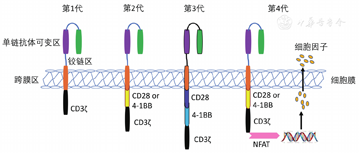 为提高CAR-T细胞的杀伤效率、降低体内不良反应发生率、杀伤肿瘤效果更持久,研究者们对CAR的结构不断进行改进和完善,并根据CAR的结构特点对其命名,从最初的第一代CAR-T细胞发展到目前第四代CAR-T细胞经历了近30年的时间(图1)。