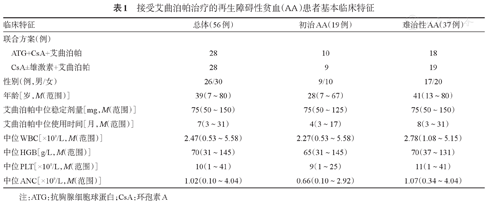 | 临床特征 | 总体(56例) | 初治AA(19例) | 难治性AA(37例) | |