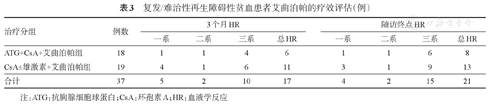 共计37例难治性患者中,应用艾曲泊帕治疗后3个月HR率为45.9%(17/37),10例(27.0%)获得三系HR,2例(5.4%)获得二系HR,5例(13.5%)获得一系HR;至随访终点时最佳HR率为57%(表3)。