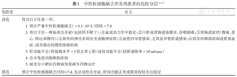 | 低危 | 预计中性粒细胞缺乏时间≤7 d,无活动性合并症,肝肾功能正常或损害较轻并且稳定 | |