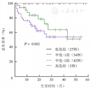 通过似然比对MIPSS70-plus和DIPSS两种预后积分系统进行比较,MIPSS70-plus的-2log似然比显著低于DIPSS(86.355对95.990,P=0.001),显示MIPSS70-plus较DIPSS有更准确的预后分组预测能力。