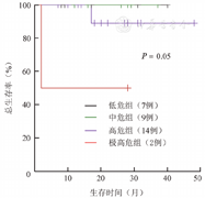 接受芦可替尼或以芦可替尼为基础的联合治疗的PMF患者共32例。应用MIPSS70-plus预后积分系统进行预后分组,低危组、中危组、高危组、极高危组患者分别为7例(21.9%)、9例(28.1%)、14例(43.7%)和2例(6.3%),2年预期OS率分别为100%、100%、88.9%(95%CI 78.4%~100%)、50%(95%CI 14.6%~85.4%)(P=0.05)(图3)。因该组患者例数较少且中位随访时间仅为19(2~48)个月,低危组和中危组未观察到死亡患者。