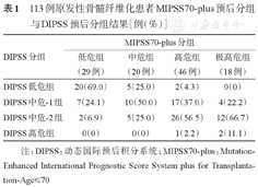 113例原发性骨髓纤维化患者MIPSS70-plus预后分组与DIPSS预后分组结果[例(%)]