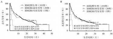 中位随访10.7(0.5~47.0)个月,单因素方差分析发现,IDH1突变型组较IDH1野生型组中位OS及PFS时间明显缩短(4.0个月对12.5个月,P=0.018;4.0个月对9.2个月,P=0.017)(图1)。IDH2突变型组与IDH2野生型组的中位OS及PFS时间差异无统计学意义(5.4个月对12.0个月,P=0.424;5.4个月对9.0个月,P=0.393),但IDH2不同的突变位点组,差异有统计学意义,R172位点突变患者的中位OS及PFS时间短于R140位点突变患者(2.0个月对7.7个月,P=0.006;2.0个月对7.0个月,P=0.008),亦明显低于IDH2野生型患者(2.0个月对12.0个月,P=0.000;2.0个月对9.0个月,P=0.000),而后两者差异无统计学意义(P=0.975,P=0.973)(图2)。
