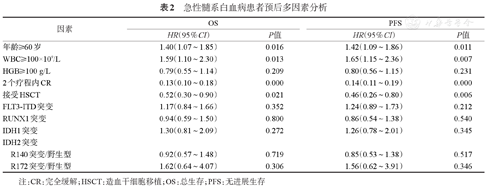 将单因素分析中P<0.05的因素纳入多因素分析发现,年龄≥60岁、WBC≥100×109/L是影响患者OS及PFS的独立危险因素,2个疗程内CR、造血干细胞移植是影响患者OS及PFS的有利因素(表2)。
