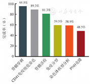 首次就诊患者中168例(95.5%)完成髂骨骨髓穿刺(骨穿),但仅有22例(17.1%)有多部位骨穿(胸骨分类);143例(85.1%)患者完善了骨髓活检,增生极度低下、减低、活跃者分别为69例(48.3%)、47例(32.8%)和37例(25.9%)。行骨穿检查的患者中,150例(89.3%)行CD41免疫组织化学染色评估巨核细胞数量,正常巨核细胞中位数为5(0~99)个;骨髓免疫分型及染色体核型分析完成率较低,仅有100例(59.5%)患者有骨髓免疫分型检查,99例(58.9%)患者有染色体核型分析;骨髓造血祖细胞培养检查完成率最低,只有45例(26.8%)。PNH克隆筛查者有86例(48.5%)。52例(29.5%)患者检测了红细胞生成素(EPO)水平,其中50例(96.2%)出现EPO升高。全部患者门诊真实世界主要诊断流程完成率见图1。