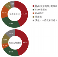 176例NSAA患者中,CsA、左旋咪唑联合雄激素为最常见治疗方案[77例(43.8%)],复诊规律组与欠规律组分别为56例(43.0%)、21例(45.7%)。45例(25.6%)患者接受CsA联合雄激素治疗方案,复诊规律组与欠规律组分别为35例(26.9%)、10例(21.7%);而单用CsA、单用雄激素的患者分别有24例(13.6%)、16例(9.1%),其中复诊规律组内单用CsA及单用雄激素的患者分别为21例(16.2%)、10例(7.7%),复诊欠规律组内单用CsA及单用雄激素的患者分别为3例(6.5%)、6例(13.1%);8例(4.5%)患者选择中药治疗,两组各4例,分别占3.1%、8.7%。6例(3.4%)患者在诊断后1年内未接受治疗,复诊规律组4例,欠规律组2例,分别占3.1%、4.3%(图2)。