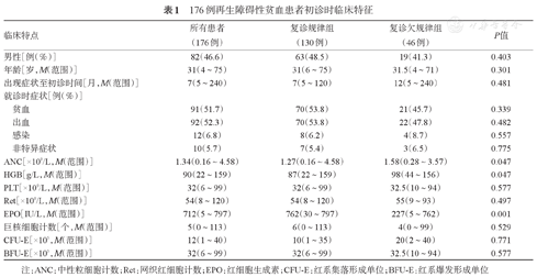 | 贫血 | 91(51.7) | 70(53.8) | 21(45.7) | 0.339 | |