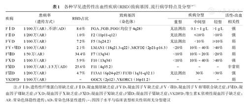 注:FⅠD:遗传性纤维蛋白原缺乏症;FⅡD:凝血酶原缺乏症;FⅤD:凝血因子Ⅴ缺乏症;FⅤ+ⅧD:凝血因子Ⅴ和Ⅷ联合缺乏症;FⅦD:凝血因子Ⅶ缺乏症;FⅩD:凝血因子Ⅹ缺乏症;FⅪD:凝血因子Ⅺ缺乏症;FXIIID:凝血因子XIII缺乏症;VKDFD:维生素K依赖性凝血因子缺乏症;AR:常染色体隐性遗传;AD:常染色体显性遗传;-:因因子水平与临床表型相关性弱而无分型建议