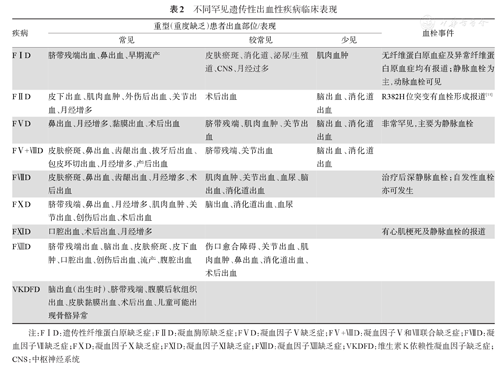 | FⅡD | 皮下出血、肌肉血肿、外伤后出血、关节出血、月经增多 | 术后出血 | 脑出血、消化道出血 | R382H位突变有血栓形成报道[13] |
