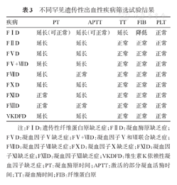 注:FⅠD:遗传性纤维蛋白原缺乏症;FⅡD:凝血酶原缺乏症;FⅤD:凝血因子Ⅴ缺乏症;FⅤ+ⅧD:凝血因子Ⅴ和Ⅷ联合缺乏症;FⅦD:凝血因子Ⅶ缺乏症;FⅩD:凝血因子Ⅹ缺乏症;FⅪD:凝血因子Ⅺ缺乏症;FXIIID:凝血因子XIII缺乏症;VKDFD:维生素K依赖性凝血因子缺乏症;PT:凝血酶原时间;APTT:激活的部分凝血活酶时间;TT:凝血酶时间;FIB:纤维蛋白原