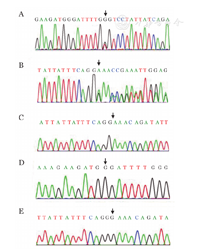 A:先证者c.1258G>T杂合错义突变;B:先证者c.4797delG缺失突变正向测序;C:c.4797delG缺失突变克隆测序;D:第8外显子c.1258野生型;E:第14外显子野生型