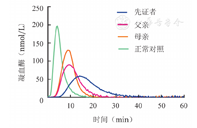 先证者的峰高明显降低,凝血酶生成潜力略微降低,峰高比值为29.6%,显著降低;而其延迟时间(lag time)和达峰时间(tt peak)比值分别延长为3.01和2.92;其父母上述指标也均发生不同程度变化(表2、图3)。