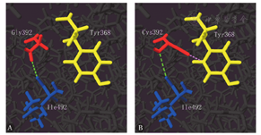 MutationTaster、PolyPhen-2、PROVEAN、LRT和SIFT五个在线生物信息学软件对p.Gly392Cys预测结果分别为1.00分、1.00分、-7.67分、0.00分和0.00分,均显示为可影响蛋白质功能的致病突变;MutationTaster对p.Glu1572Lys fsX19预测结果为1.00,显示为可影响蛋白质功能的致病突变。突变蛋白质空间结构模型分析显示:野生型FⅤ蛋白的分子模型结构中Gly392与I1e492之间存在1条氢链,当Gly392突变为Cys392时,其分子之间的氢键明显延长,并且Cys392与Tyr368之间产生了空间位阻,使蛋白质结构发生改变,可能导致蛋白质的稳定性下降(图5)。