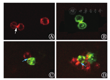 A:示CD19 CAR-Nalm-6细胞自身CD19表达位点被CD19 CAR占据(白色箭头所示);B:示Nalm-6细胞强表达CD19;C~D:示Nalm-6细胞CD19表达位点被CD19 CAR-Nalm-6细胞CD19 CAR占据(蓝色箭头所示)